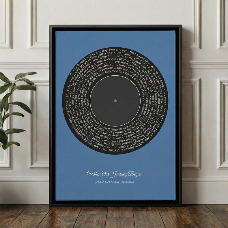 The Vinyl Moments Collection arranges the full lyrics of your custom Mynstrell song into a flowing spiral inspired by the grooves of a classic vinyl record.